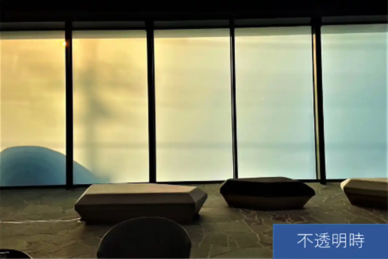 フィルムは通常は不透明な状態であり、電気を流すことで透明になります。
